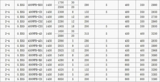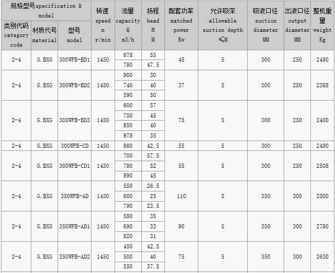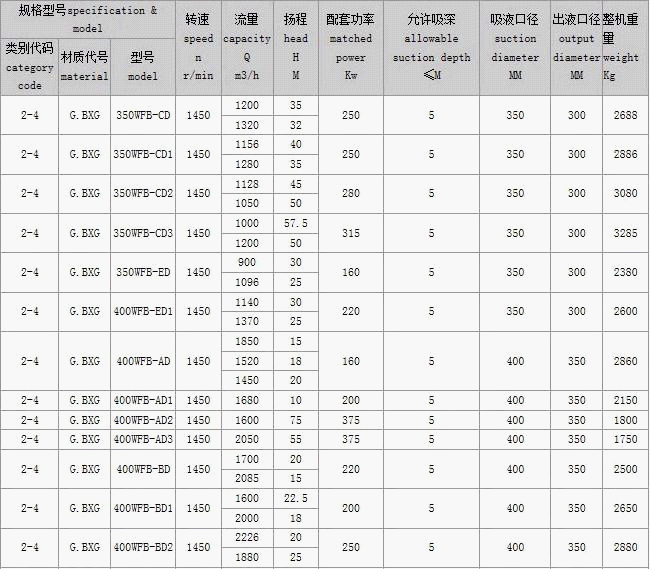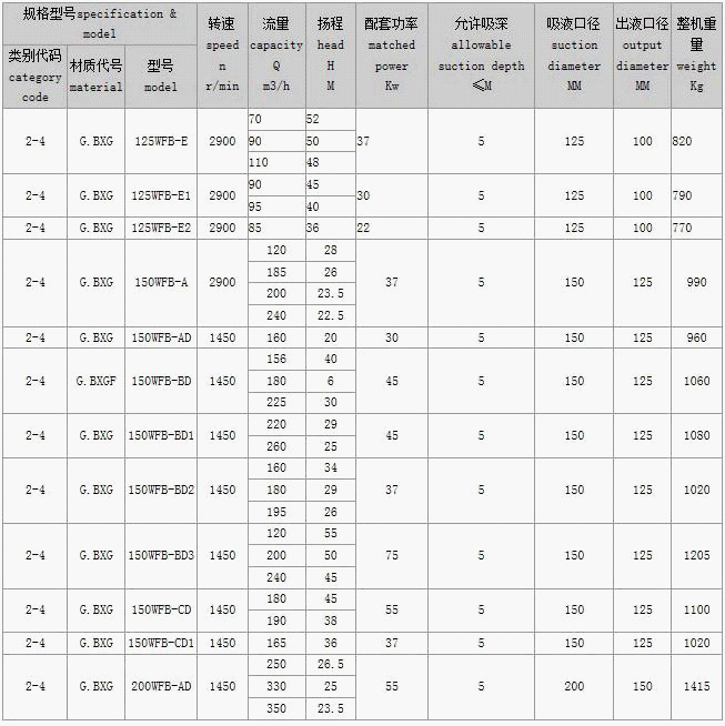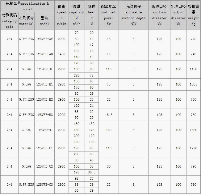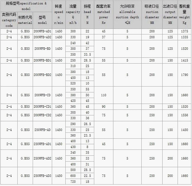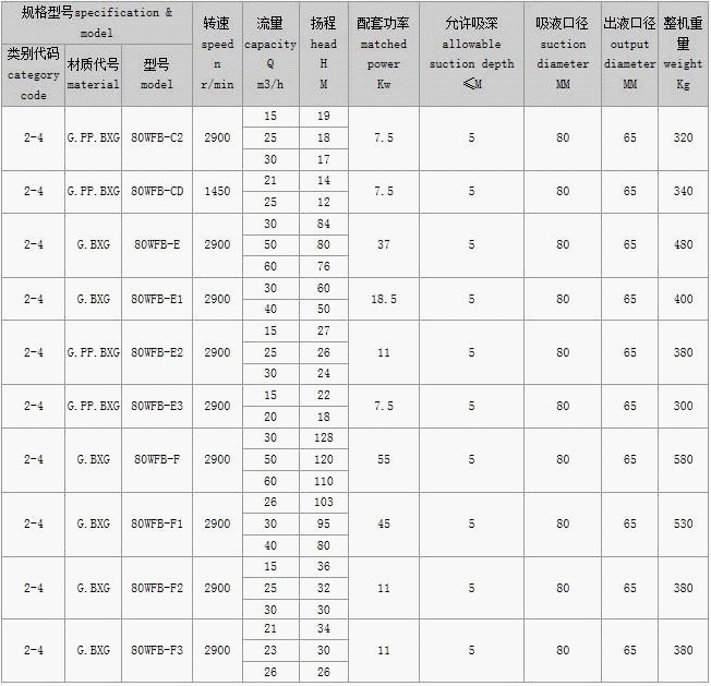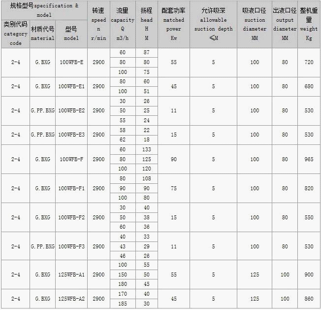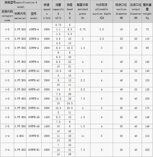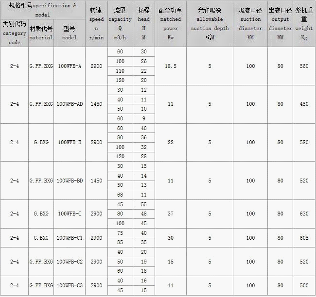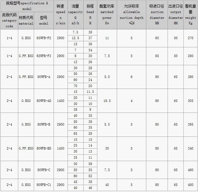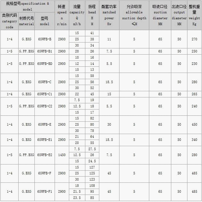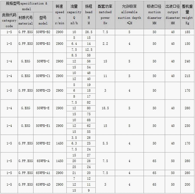 三、選型方法(1)性能參數(shù)表中“類別代碼”欄的1-5含義:1型為長方型,2型為圓錐型,3型為防爆型,4型為戶外型,5型為推車移動型。“材質(zhì)符號”欄中G、PP、BXG四組字母分別代表:鋼、增強聚丙烯、不銹鋼(1Cr18Ni9Ti)四種材質(zhì)。 (2)型號意義舉例: (3)完整的型號書寫方式。假設(shè)水泵的要求是:造型為推車移動型,材質(zhì)為增強聚丙烯,吸液口徑為50mm,性能分類為AD1。這臺水泵的完整型號為“5PP50WFB-AD1” 假設(shè)水泵造型是長方形防爆型,其它要求同上,這水泵的完整型號應(yīng)寫為“1.3PP50WFB-AD1” 假設(shè)水泵造型是圓錐形防爆型,其它要求同上,這水泵的完整型號應(yīng)寫為“2.4PP50WFB-AD1” (4)水泵的法蘭采用中華人民共和國國家標準制造。標準代號GB9115.2-88;GB9115.3-88。非金屬材質(zhì)水泵的法蘭壓力0.6MPa;金屬材質(zhì)水泵的法蘭壓力1.0MPa。本公司水泵出廠時,進出液口配一只反法蘭。